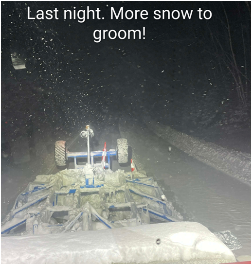 -5°C avec quelques chutes de neige ce matin à Bathurst. Je vous souhaite un excellent dimanche. Les sentiers étaient très fréquentés hier en raison de plusieurs événements. Comme je l'ai déjà mentionné, une dameuse est hors service pour le reste de la saison, mais les dameuses n° 2 et 3 étaient en service hier soir à Nepisiguit et Rogers Lake, pilotées par Jacob et François. Les sentiers 23, 22, 507 et 550 (boucle Cal) ont été préparés.