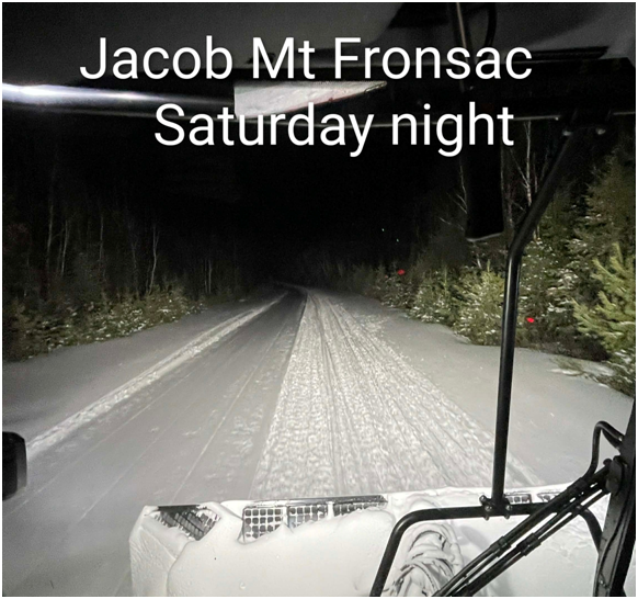 Yesterday, we groomed from Nepisiguit to NineMile Shelter, Trail 22 to Chaleur, Forty Cluster, and the California Loop. When we finished that run, Jacob took the #3 from Rogers Lake to Governors and also the Mt Fronsac Loop. This should put us in decent shape with today being a little on the mild side with some snow and rain. We’ll see what happens in the week to come, but there is still some decent sledding left.